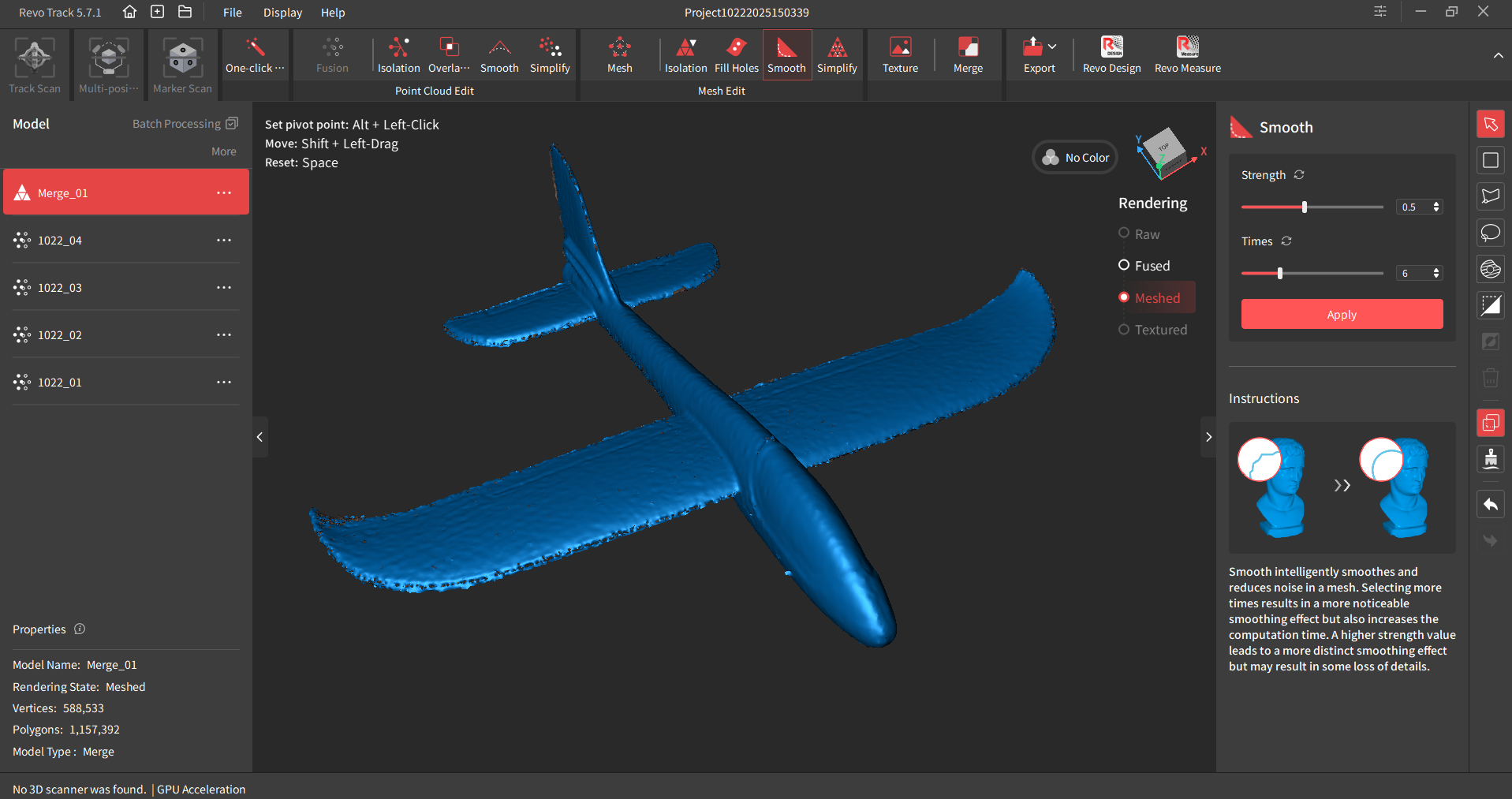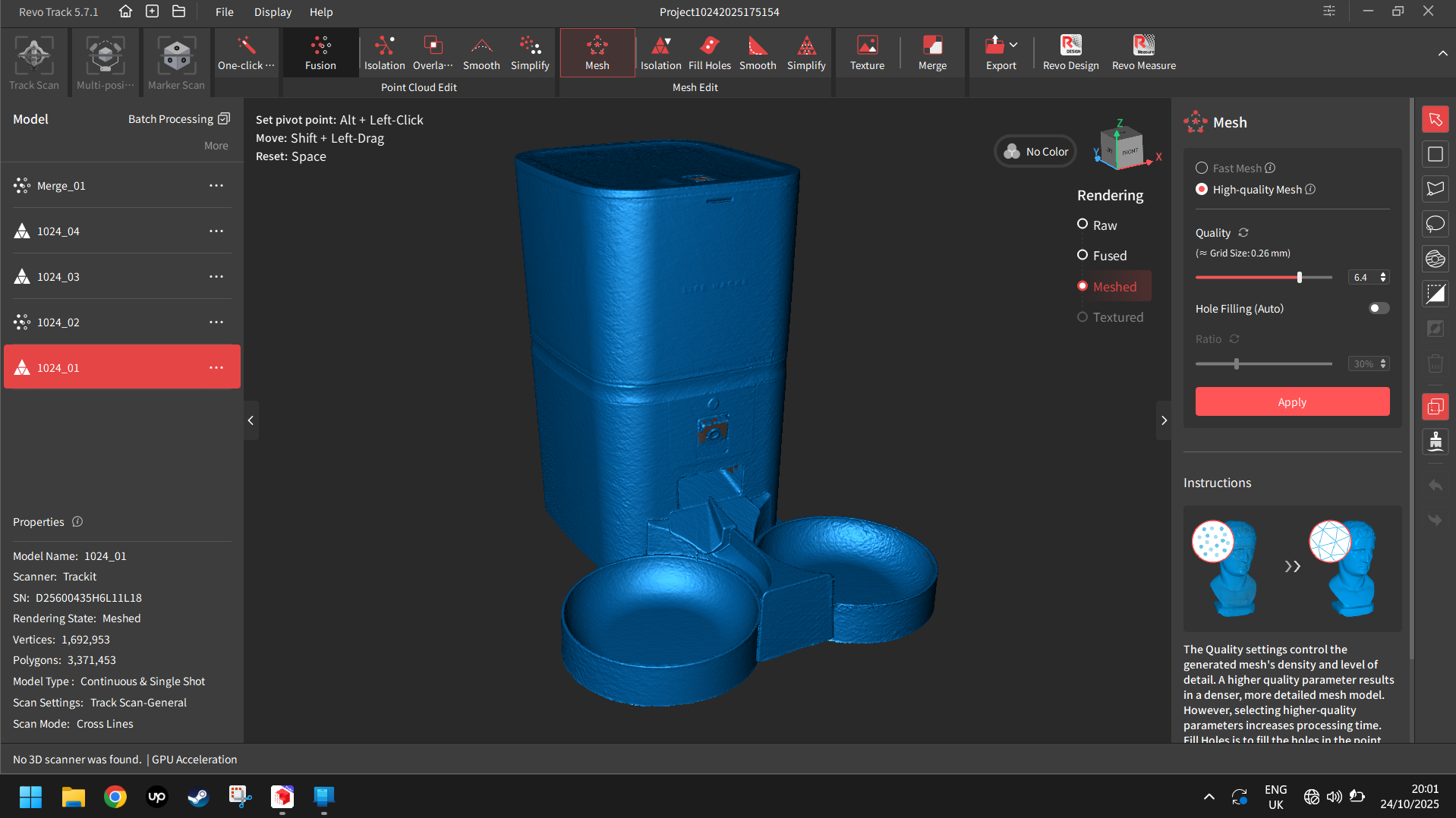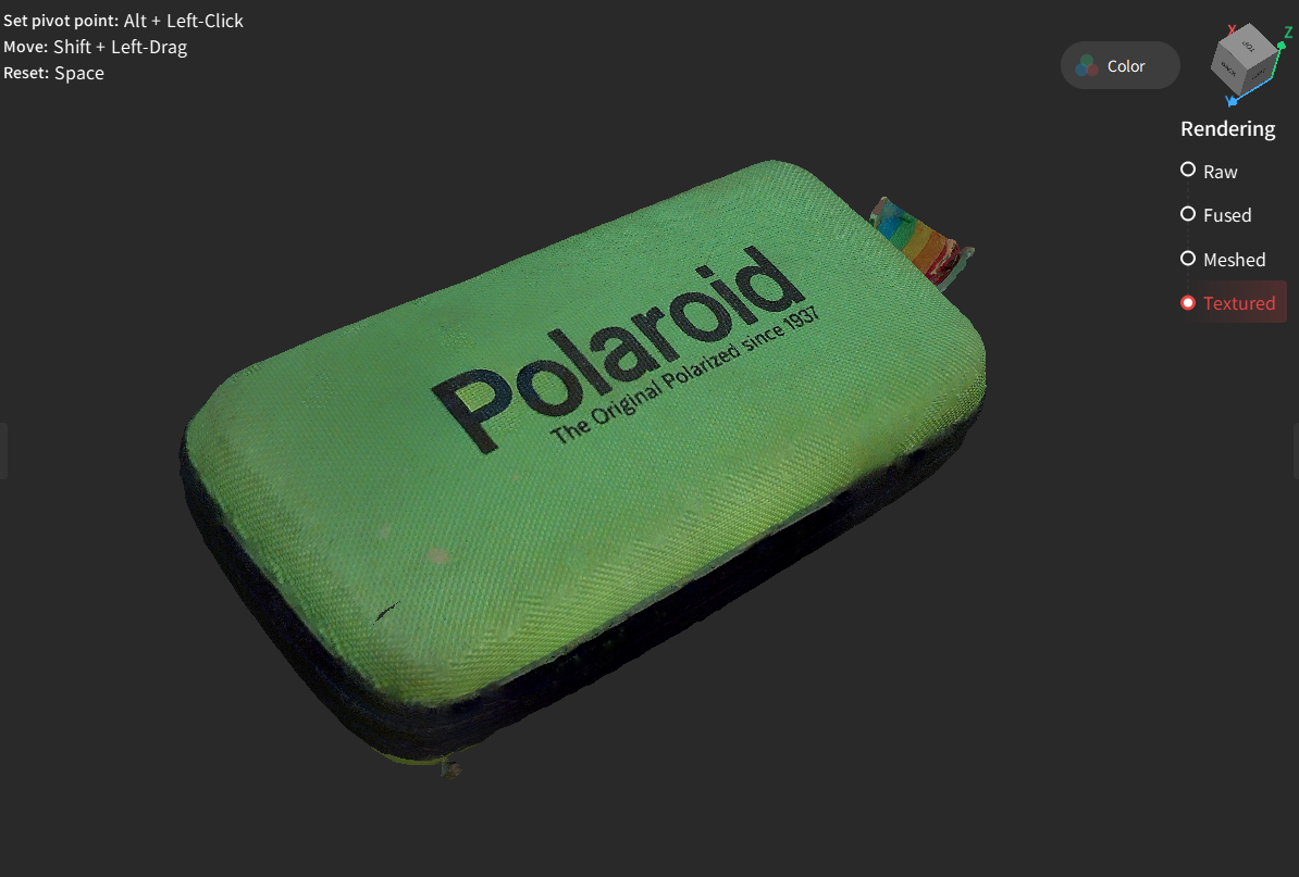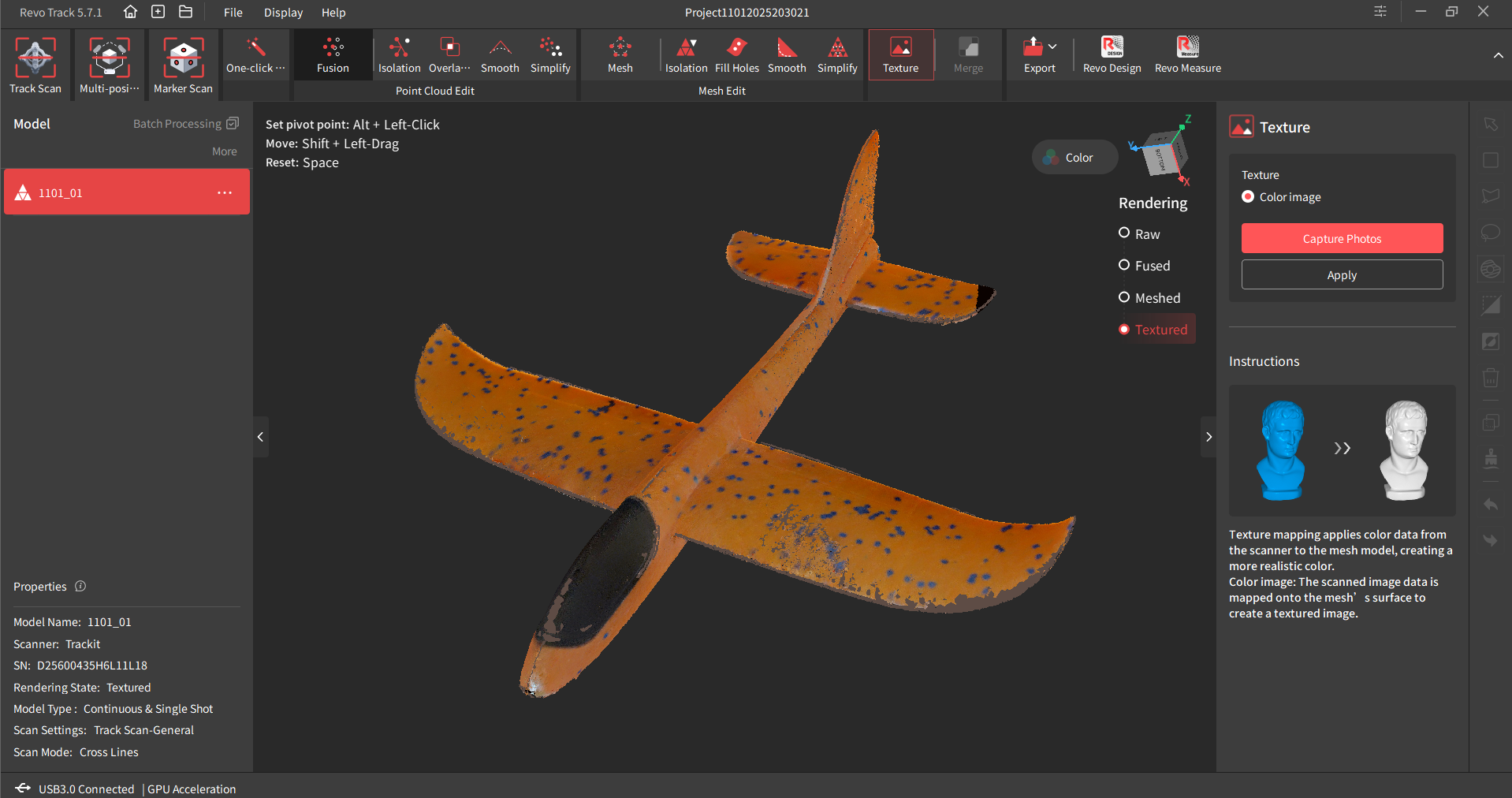 As soon as the purpose cloud and texture knowledge is captured, merely course of the purpose cloud (fusion and mesh) after which click on the feel button within the software program. It is going to then apply your texture to the cleaned mesh.