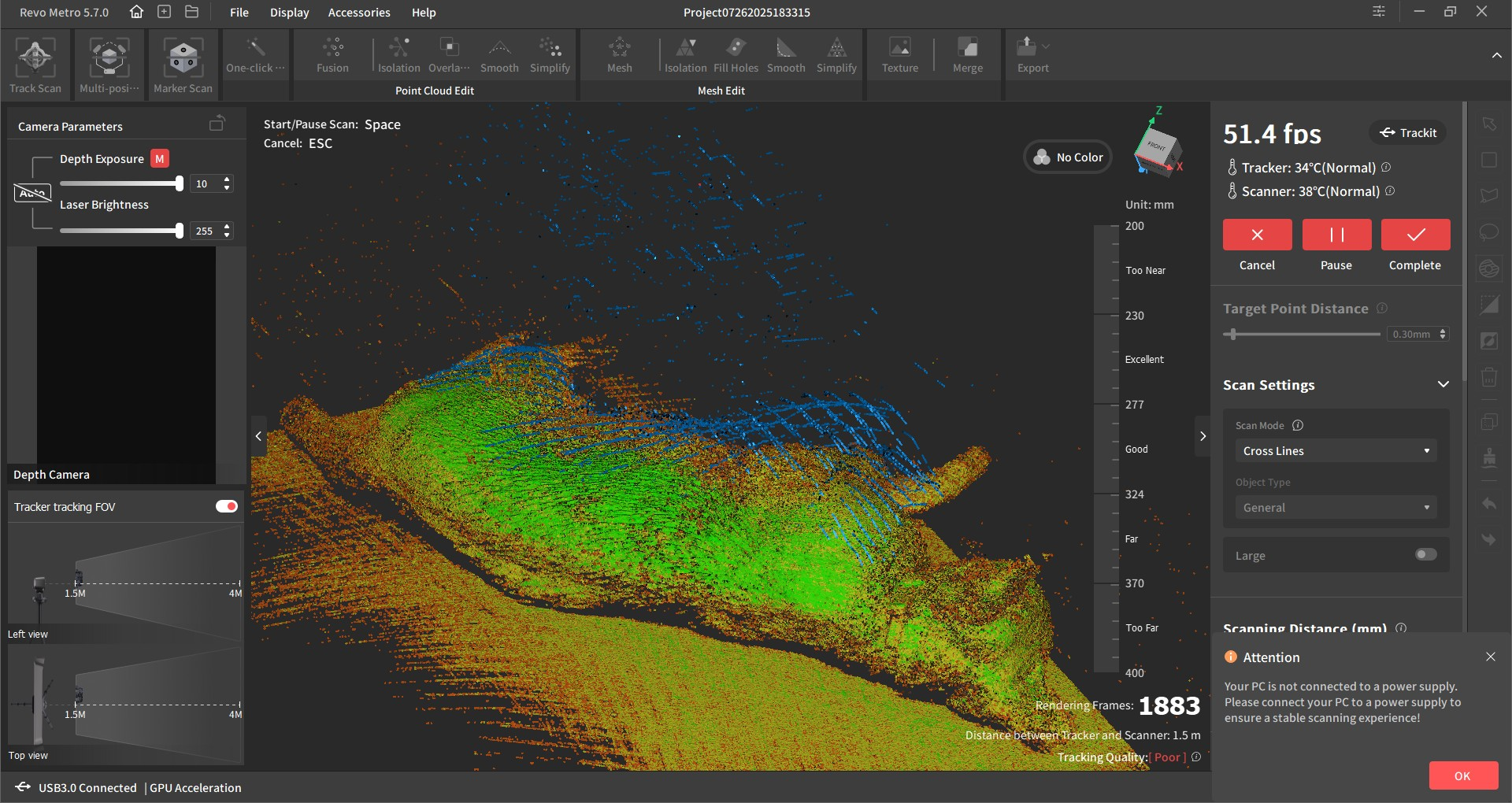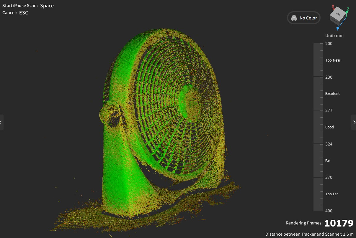 Throughout this check, I began experimenting with the Goal Level Distance. By default it’s set to 0.2mm At this worth, the scan can typically require a number of passes with a purpose to get the purpose cloud to show inexperienced (indicating an excellent scan). Nonetheless, cranking that distance to between 0.8mm and 1.2mm actually speeds issues up. At this setting, I discovered that I might seize bigger areas with one or two passes. For an object this dimension and this stage of element, it was completely positive.